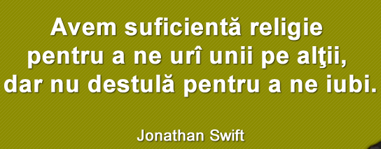Descopera si alte cuvinte celebre accesate chiar acum de vizitatori... Acestea iti aduc in fata mai multe perspective cu privire la subiect. 27.05.2011 · citate despre religie (ii) religia : Cele mai frumoase citate despre credinta. „avem suficientă religie pentru a ne urî unii pe alţii, dar nu destulă pentru a ne iubi." — jonathan swift dragoste religie.. Pagina citate religie a fost marcata de un moderator ca incompleta, pe motivul prea putine citate despre religie si va fi revizuita si imbunatatita in curand.